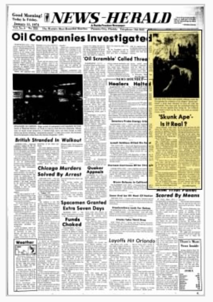 SKUNK APE:Police and wildlife officials comb the Everglades for evidence of an alleged “skunk ape” which a local man claimed to have hit with his automobile. The man said the unclothed being ran away into the ‘glades after being hit. No evidence was found to back up the fact that such an animal exists.