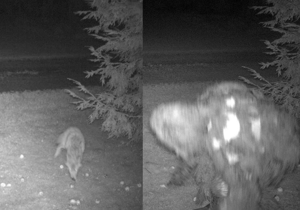 Now back to the trail cam photo. while everyone can agree that’s a coyote on the left, what the hell is happening over there on the right? A question a man named Frank was wondering. Frank’s apple trees were continually missing apples and trying to get to the bottom as to who or what was taking them he set up cameras and this picture was the result.