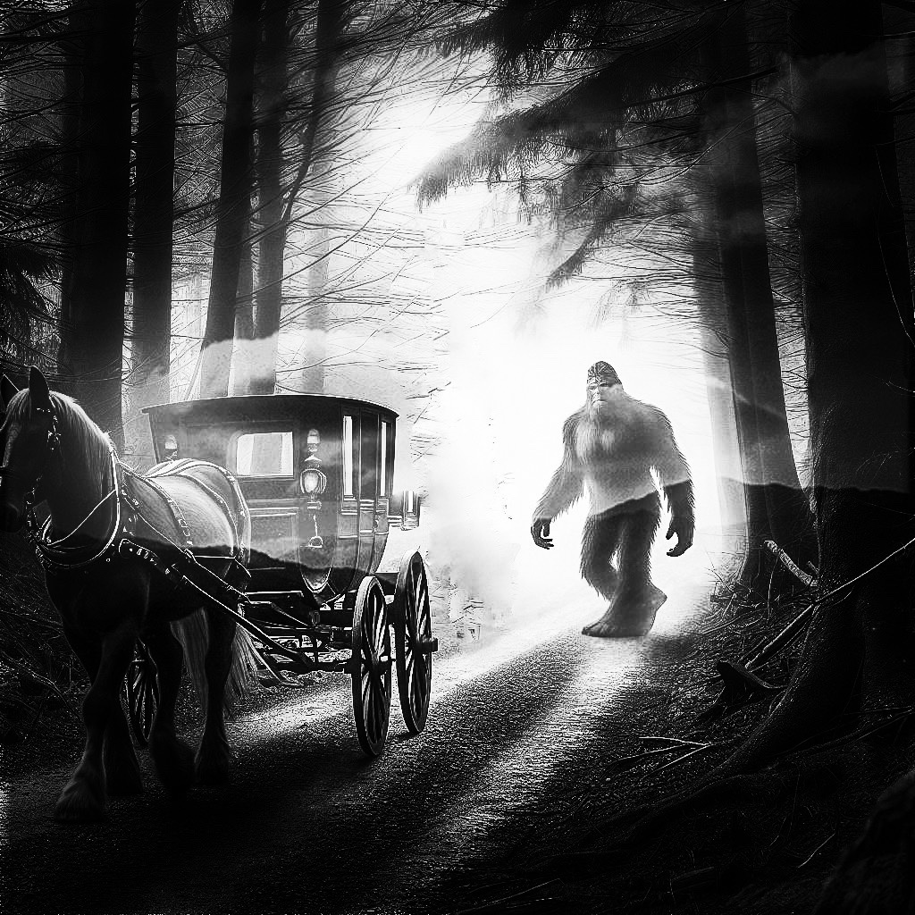 The giants walked with an easy gait across the swamp flats and at the Morris Creek, in the shadow of Little Mystery Mountain, straddled a floating log, which they propelled with their long, hairy hands and huge feet across the sluggish glacial stream to the opposite side.