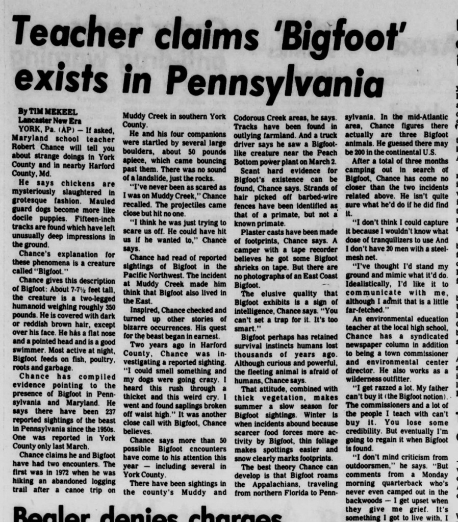 If asked, Maryland school teacher Robert Chance will tell you about strange doings in York County and in nearby Harford County, Md.He says chickens are mysteriously slaughtered in grotesque fashion. Mauled guard dogs become more like docile puppies. Fifteen-inch tracks are found which have left unusually deep impressions in the ground. Chance’s explanation for these phenomena is a creature called “Bigfoot.” Chance gives this description of Bigfoot: About 7-12 feet tall, the creature is a two-legged humanoid weighing roughly 350 pounds. He is covered with dark or reddish brown hair, except over his face. He has a flat nose and a pointed head and is a good swimmer.