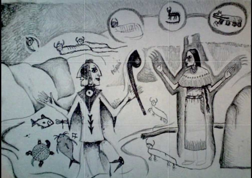 “Many years ago a huge and fearsome creature began to carry off members of that tribe of Indians called the Illinois. Whole villages were depopulated. One night Ouatoga, a brave chief of this tribe, had a dream. In this dream the Great Spirit gave him a plan by which he could kill the man-eating creature.