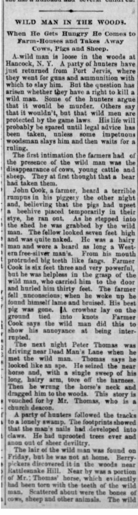 “A wild man is loose in the woods at Hancock, N. Y. A group of hunters have just returned from Port Jervis, where they went for guns and ammunition with which to slay him.