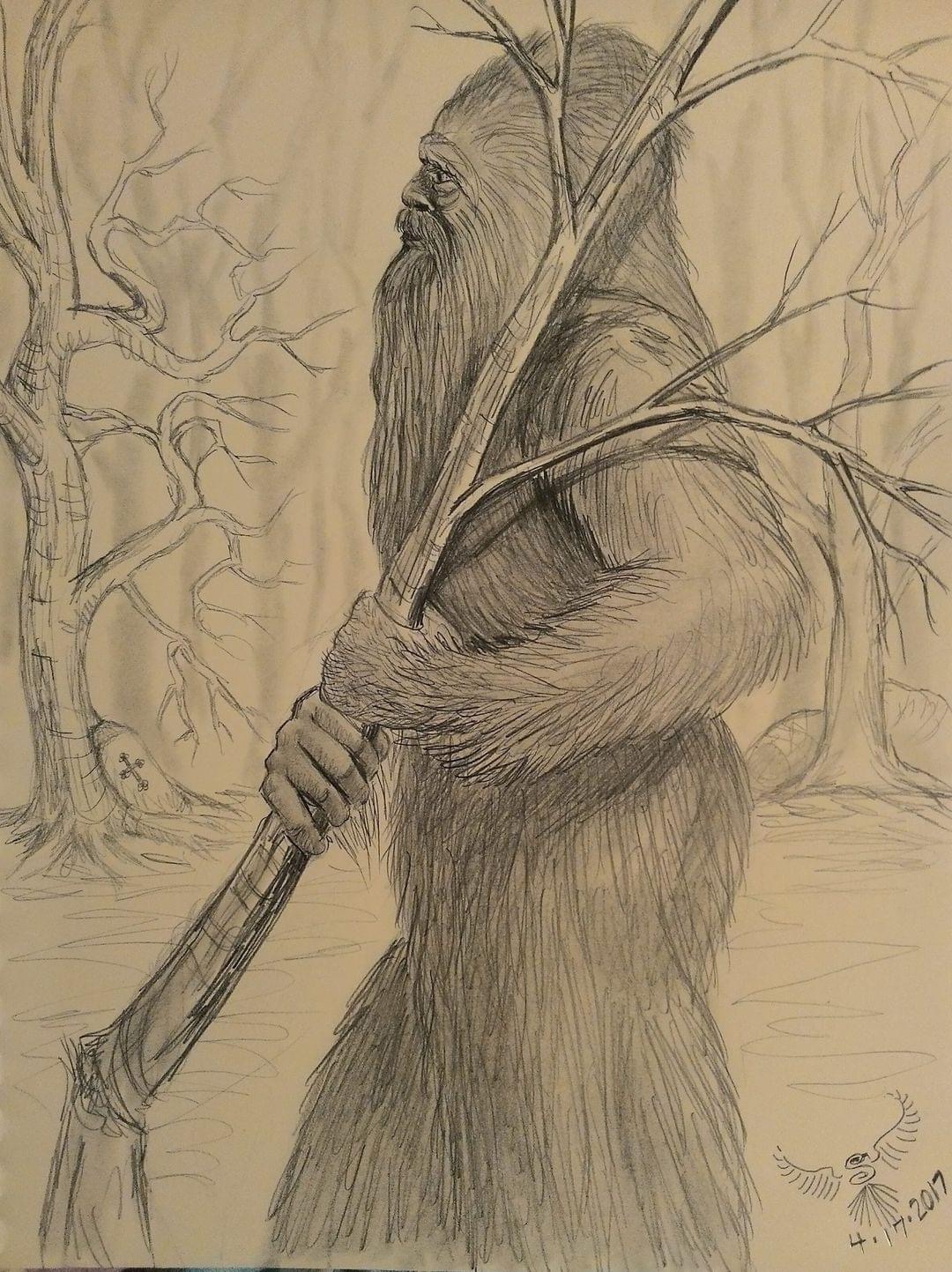 “It was about six feet tall.” Mr. Raser said. “It weighed 250 to 300 pounds, and it was covered with long, brown heir. It had a flat face with deep‐set eyes, and the palms of its hands were hairless; if I didn’t know better, I’d have said it was a man dressed up in e monkey suit.”